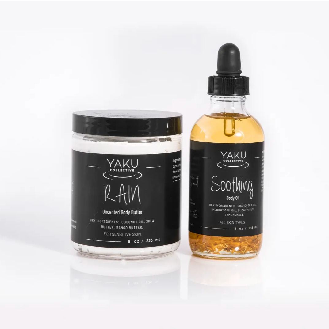 Our Body Kit includes two of our most potent body moisturizers. Our Soothing Body Oil was created to hydrate dry skin, ease aching muscles, and support mental clarity, whilst our Body Butter was developed to protect and restore healthy, moisturized, and supple skin.